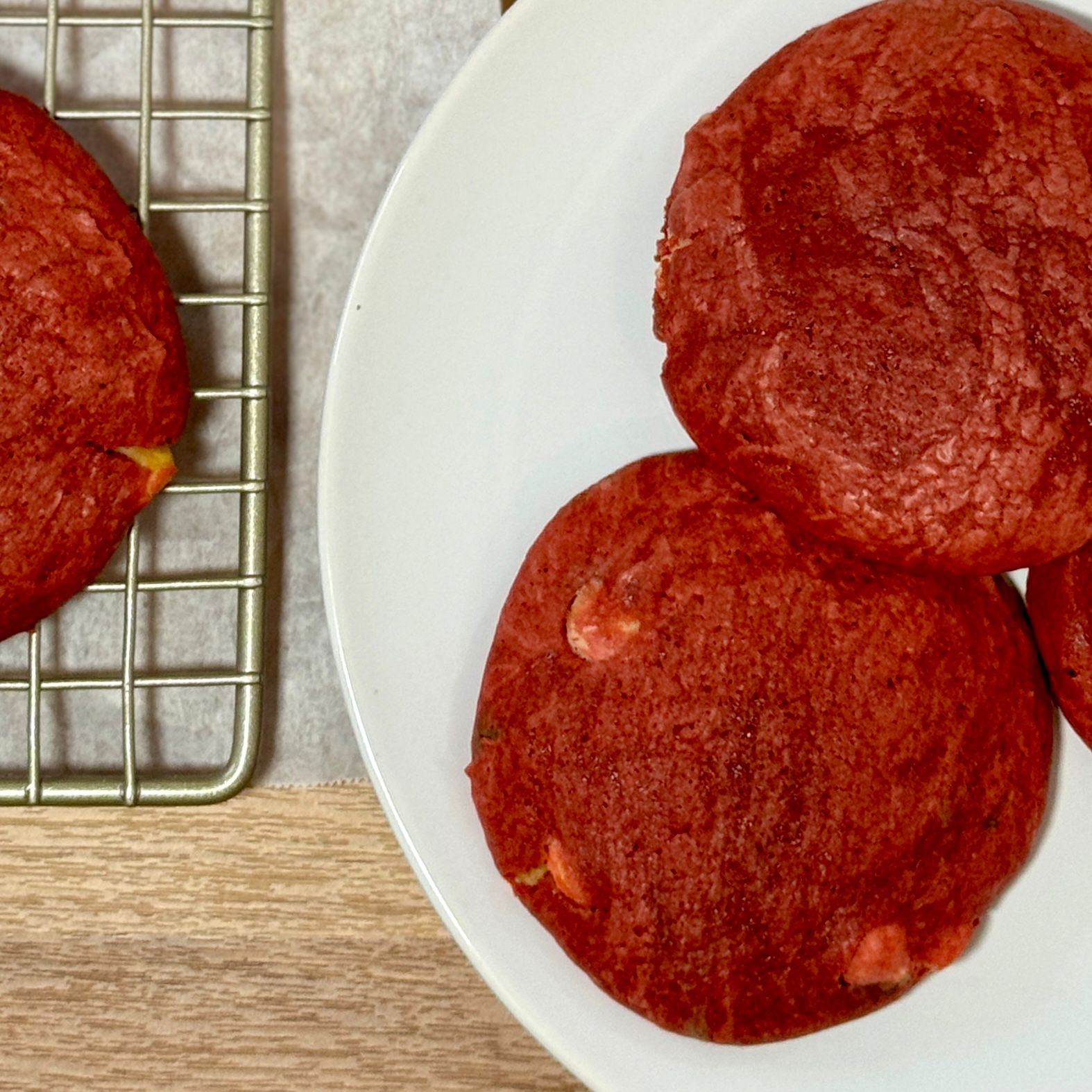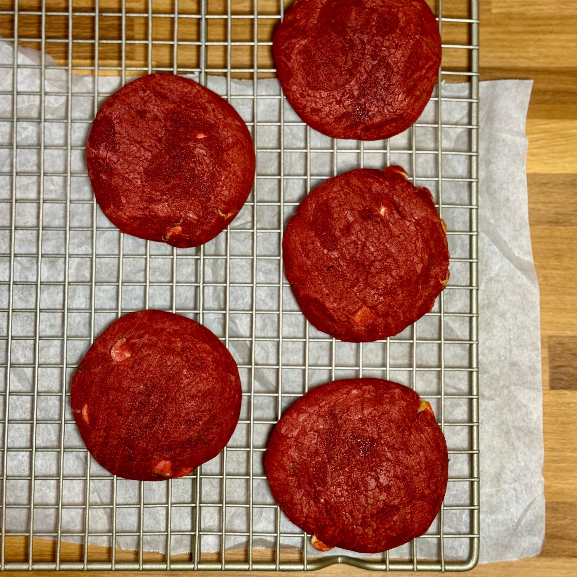 Ingredients: flour (bleached wheat flour), butter (vegetable oil blend), water, salt, white sugar, eggs, cocoa powder, red food coloring, vanilla extract, white vinegar, salt, baking powder & white chocolate chips.